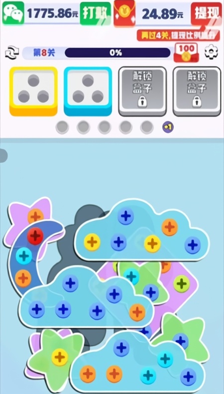 2、游戏最上面会显示出过关进度,一旦达到了 100%,就能直接过关领取对应的红包,所以要时刻关注进度,合理安排螺丝消除顺序,尽快达到过关条件。