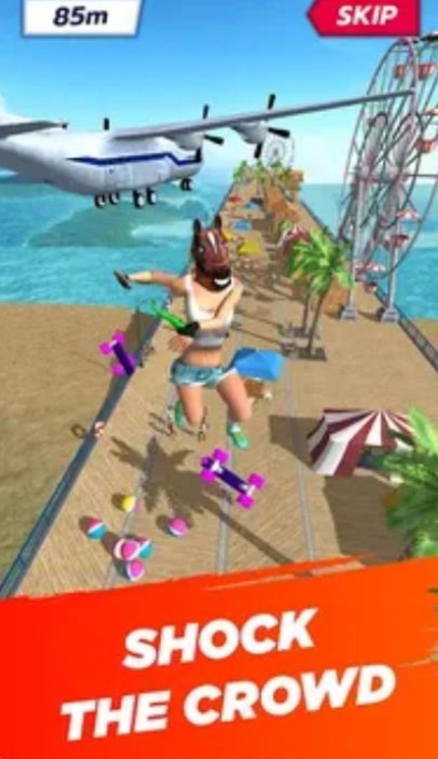 2.包含 5 类主题关卡(街头赛道、公园坡道、校园走廊等),每个关卡隐藏特殊障碍物(如移动的汽车、旋转的广告牌),