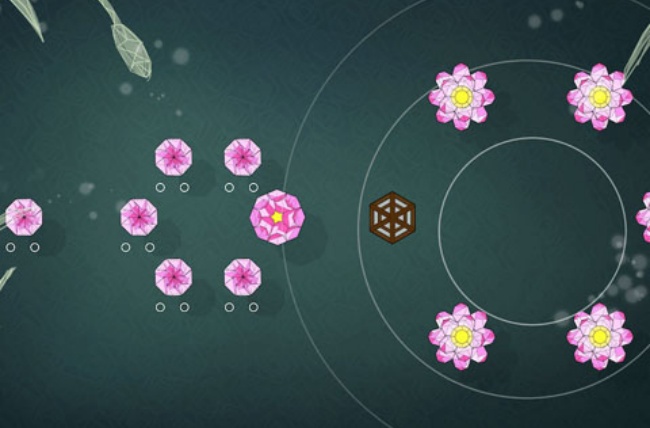 2、几何原理:通过点触式操作在池塘里泛起的莲漪会影响荷花、荷叶等场景,通过计算多个涟漪的交点及其移动轨迹唤醒沉睡的莲花,简单而有趣。