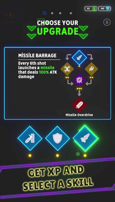 操作方式:玩家进入游戏后选择飞机,通过滑动屏幕上下左右控制战机移动,战机自动射击。点击屏幕可触发技能,击碎上方的方块获得经验,升级后可学习新技能。