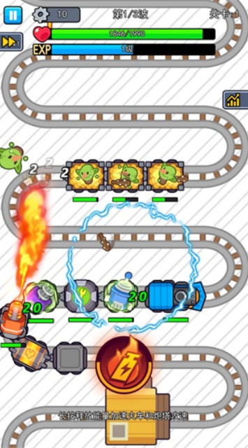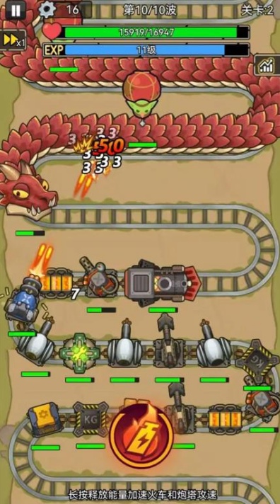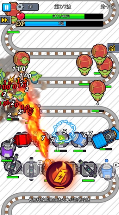 3、放好炮塔后点击开始战斗火车会自动前进,车厢上的炮塔也会自动攻击,点击屏幕中间的按钮可以加速火车和炮塔攻速。