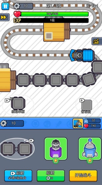 2、进入关卡后玩家需要将炮塔放在火车车厢上,相同的炮塔可以合并来提升等级。
