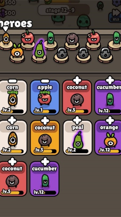玩家点击下方的英雄按钮可以召唤不同的水果,选择上阵或者用来强化其他水果,还可以消耗钻石解锁新的空位来上阵新的英雄。