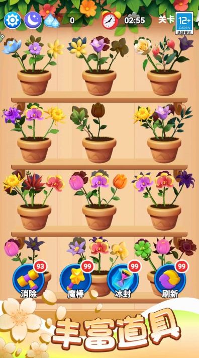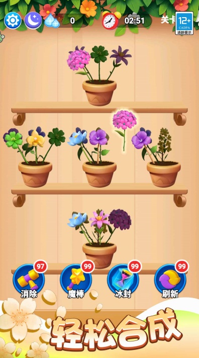 1、同花合盆的消除方式很特别,和常见的连线消除不一样,只需要凑够一盆 3 朵,既有消除的乐趣,又很新鲜。
