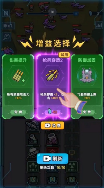 2、不断的消灭沿路的怪物,获取新的技能,点击选择其中一个技能,提升防御塔的战斗力。