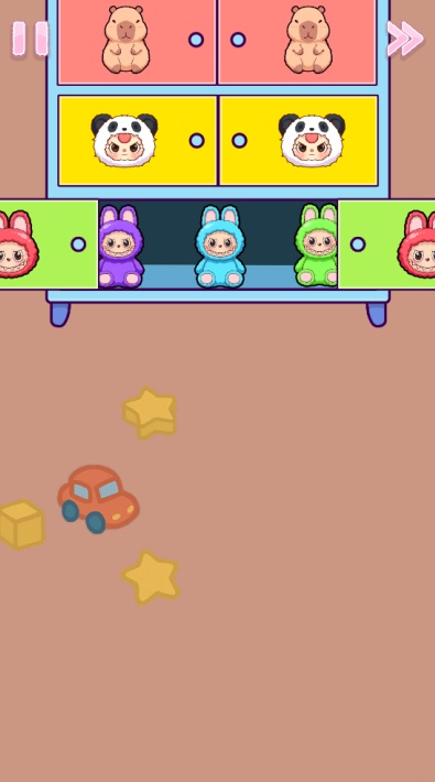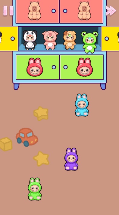 前期还有基础整理关卡,比如把玩偶分类放进对应收纳桶、用扫把清理地毯污渍等,完成后就能解锁更多房间和玩法。