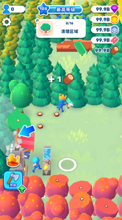 开局纯纯白手起家,啥都没有就得先砍树 —— 砍够木材才能解锁新地盘,接着建民居、仓库这些基础设施,把王国的底子搭起来。