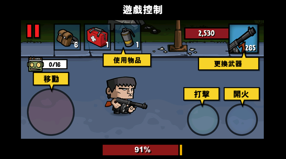 3. 消灭僵尸玩法:操控角色达成指定的僵尸消灭数量,即可完成对应任务;初期难度友好易上手,后期难度逐步升级,越玩越有挑战性。