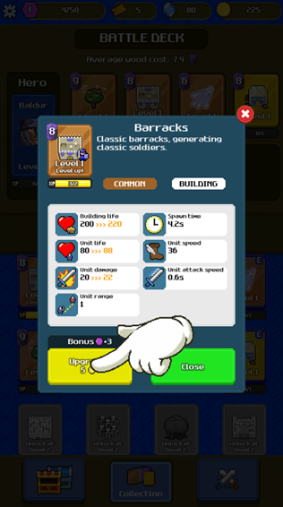 5. 开启宝箱可获得建筑碎片,碎片积累到一定数量后,点击界面“Upgrade”按钮,即可升级对应建筑,提升战力上限;