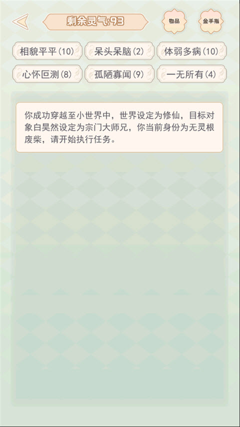 2. 每次启动快穿后,系统会随机生成全新的世界设定、初始属性和专属天赋,确认无误后,点击“进入游戏”;
