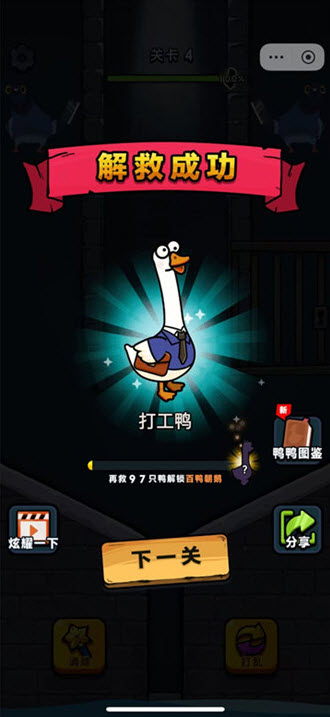 3. 萌趣收集有成就感:闯关成功可解救更多小鸭子,解锁不同造型的小鸭图鉴,收集各类萌趣造型,提升游戏成就感,增加玩法粘性。