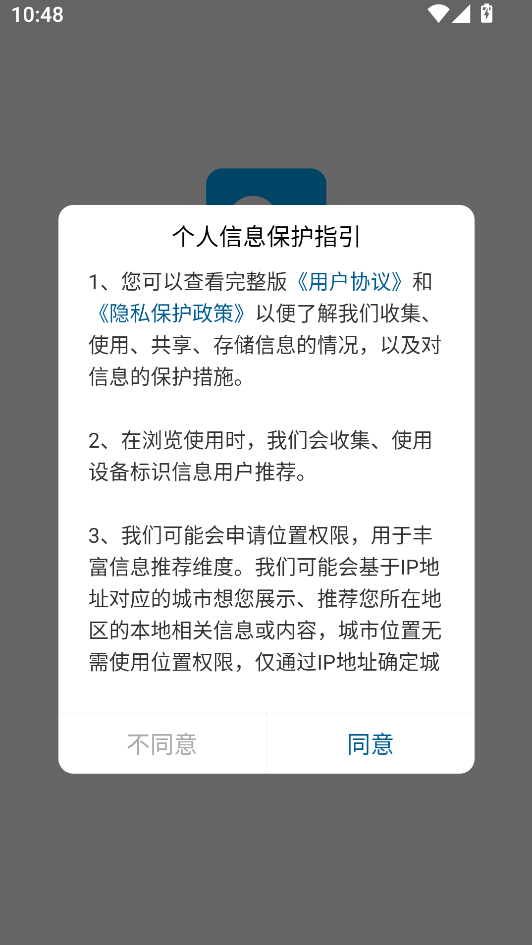 2、认真阅读白云视频隐私协议政策并同意进入。安装完成后打开app进入到主界面。