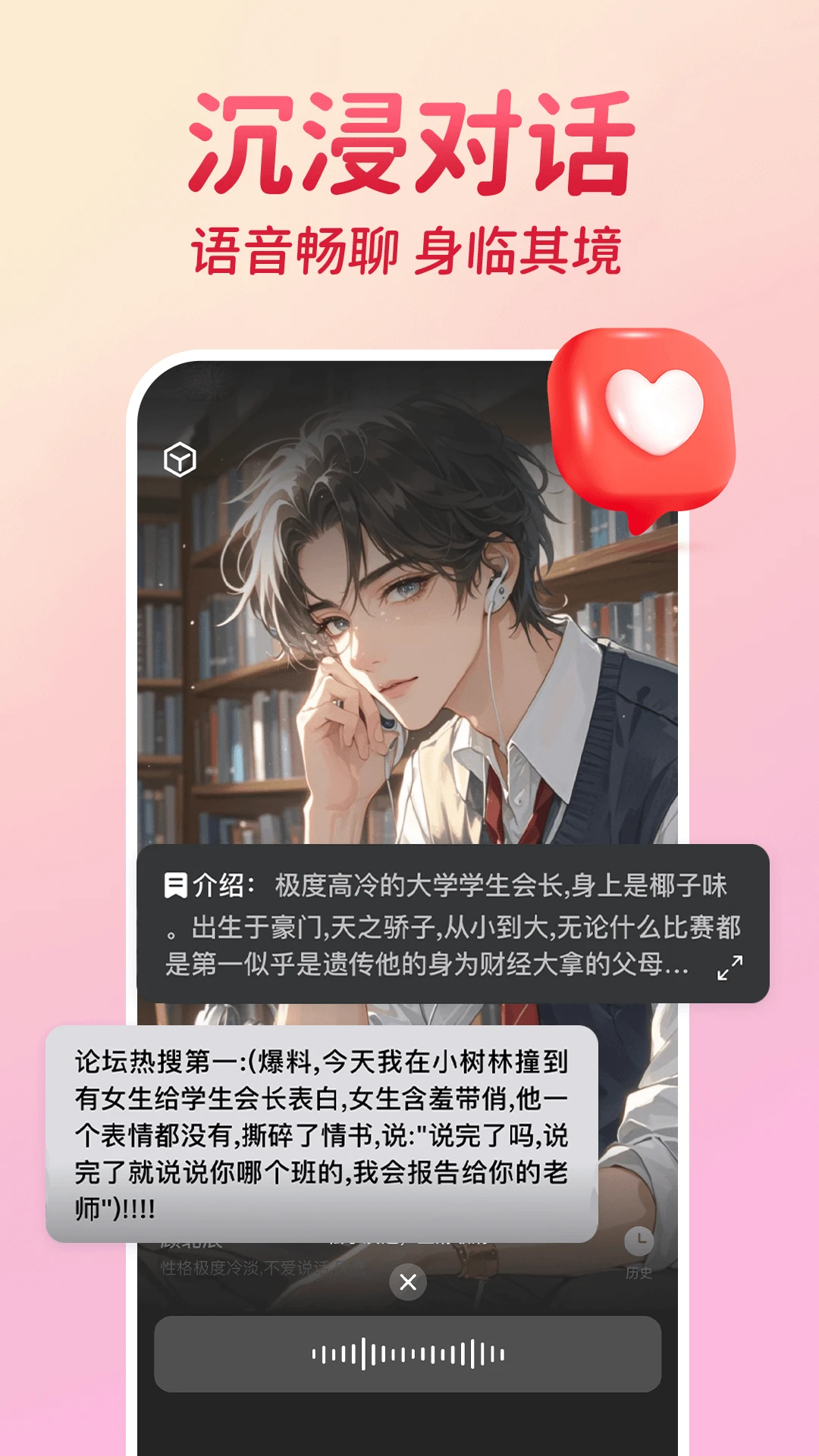 虚拟爱人聊天ai软件下载2026最新版可是现在超火的聊天社交软件,搜软下载站亲测后发现,简直是爱唠嗑、想找陪伴小伙伴的福音!虚拟爱人聊天ai手机版就是专门为想体验虚拟互动的人群打造的,不用顾虑现实中的各种束缚,怎么开心怎么聊。在这儿你能和各种风格的小哥哥、小姐姐匿名聊天,温柔御姐、阳光奶狗、可爱萌妹、搞笑直男全都有,还有超多趣味互动玩法,不管是摸鱼划水还是深夜失眠,都能靠它打发无聊时间。软件里还融了一大堆有意思的功能,二次元元素拉满的主题房间、在线K歌比拼、趣味相亲配对,还有大厅麦霸挑战赛这些,直接把社交的趣味性拉满。最绝的是,虚拟爱人聊天ai靠先进的自然语言处理和机器学习技术,不光能听懂你说的话,还能get到你的情绪和兴趣点,给你超有个性化、情感满满的虚拟伴侣体验。每次聊天都自然又温馨,就像真的有个人陪在身边一样。要是你正想找个地方抒发情感、找份陪伴,赶紧下载虚拟爱人聊天ai试试!