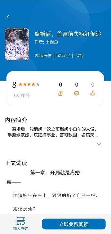 2. 在专区内可任意点击一本小说,查看小说介绍和试读页面,若感兴趣直接点击“免费阅读”即可开始阅读;