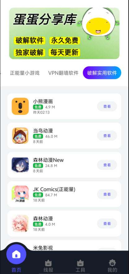 蛋蛋软件库免费版已经更新至v2.0最新版本,这是一款主打免费资源聚合的实用平台类app,蛋蛋软件库app优势在于资源覆盖面广、种类齐全,涵盖软件、游戏、小说漫画等多种内容,且全部免费提供,更有网友自制改版资源解锁付费功能,性价比拉满。蛋蛋软件库平台操作简单、资源分类清晰,支持一键搜索下载,还配备安全检测和自动更新功能,兼顾实用性与安全性。